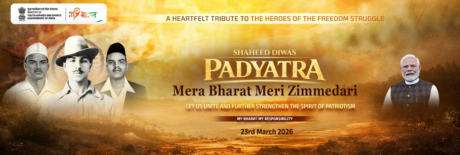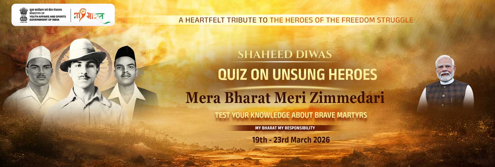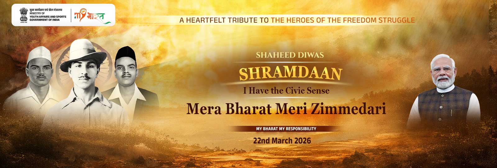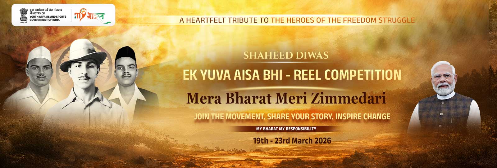 In this spirit, MY Bharat presents Shaheed Diwas 2026 under the theme “Mera Bharat Meri Zimmedari”—encouraging today’s youth to carry forward the legacy of sacrifice through conscious action, civic responsibility, and active participation in shaping the nation’s future
